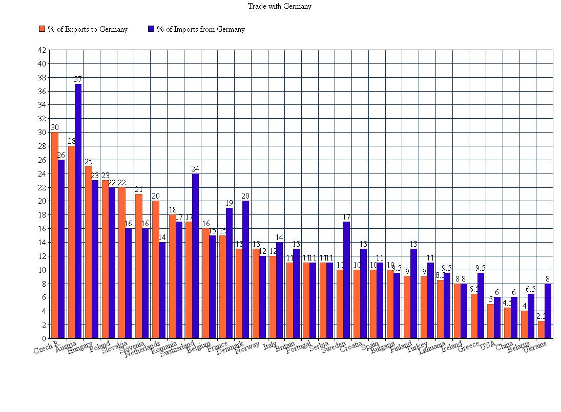 The statistics behind this trading sphere are rather impressive, considering that most of the countries within it only began trading seriously with Germany during the last two decades, following the end of the Cold War. The Central and Eastern European countries within the sphere rely on Germany for an average of 28 percent of their trade. These numbers may not be as high as, for instance, the 75-80 percent of Canadian and Mexican exports that go to the United States, but they are substantial nonetheless. By comparison, Germany accounts for only 12 percent of Britain’s trade.