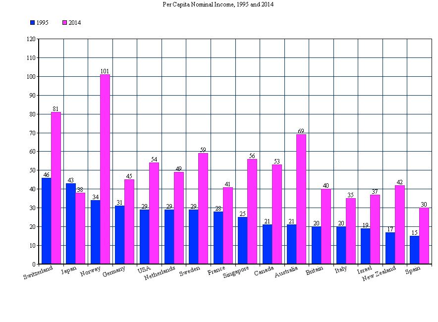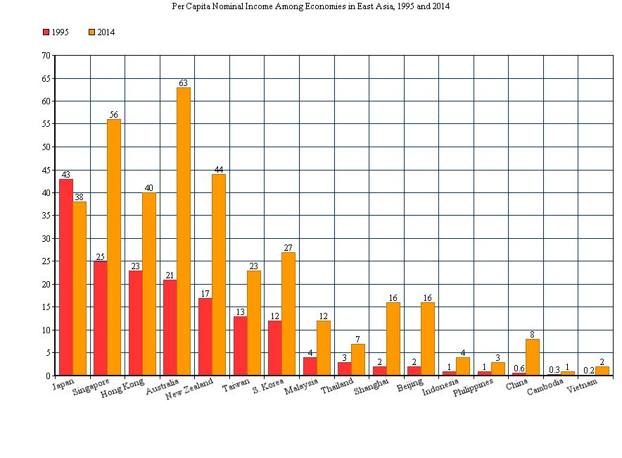 In the case of Japan, the extremely high income levels the country had two decades ago might have limited its economy’s ability to grow. According to the IMF, in 1995 Japan’s per capita income was 1.5 times higher than that of the next wealthiest large developed economy (the United States), 2 times higher than that of the next wealthiest large economy in the western Pacific (Australia), and 3.3 times higher than that of the next wealthiest economy in Northeast Asia (Taiwan). As a result of being so wealthly at the time, Japan’s room to expand its economy further may have been somewhat constrained.