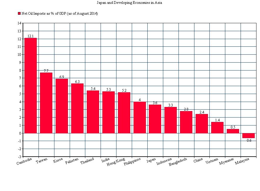 Of course, a developed, energy-efficient economy like Japan is not going to benefit nearly as much from falling energy prices as an energy-intensive, import-dependent emerging market like India, Pakistan, Thailand, the Philippines, or, on the wealthier side of the emerging market spectrum, South Korea or Taiwan (see graph). Even China, which only imports an estimated 13 percent of its energy (compared to 94 percent for Japan), will probably benefit much more from falling energy prices than Japan will, since the Chinese use about 5 times as much energy per dollar of GDP than the Japanese, are enormously dependent on importing commodities in general, and may be able to reduce some of their domestic pollution by replacing coal production with oil and gas imports.