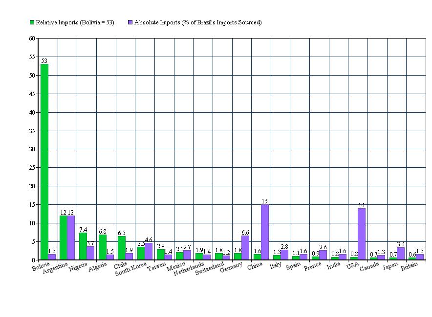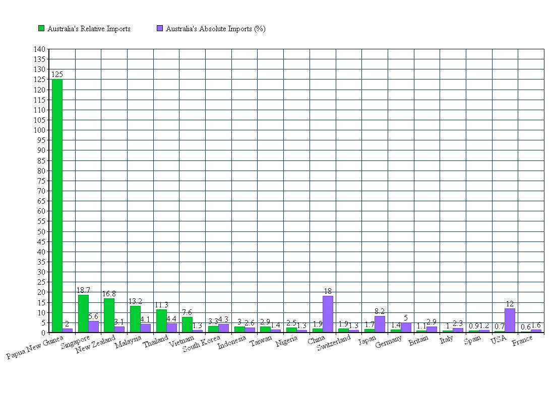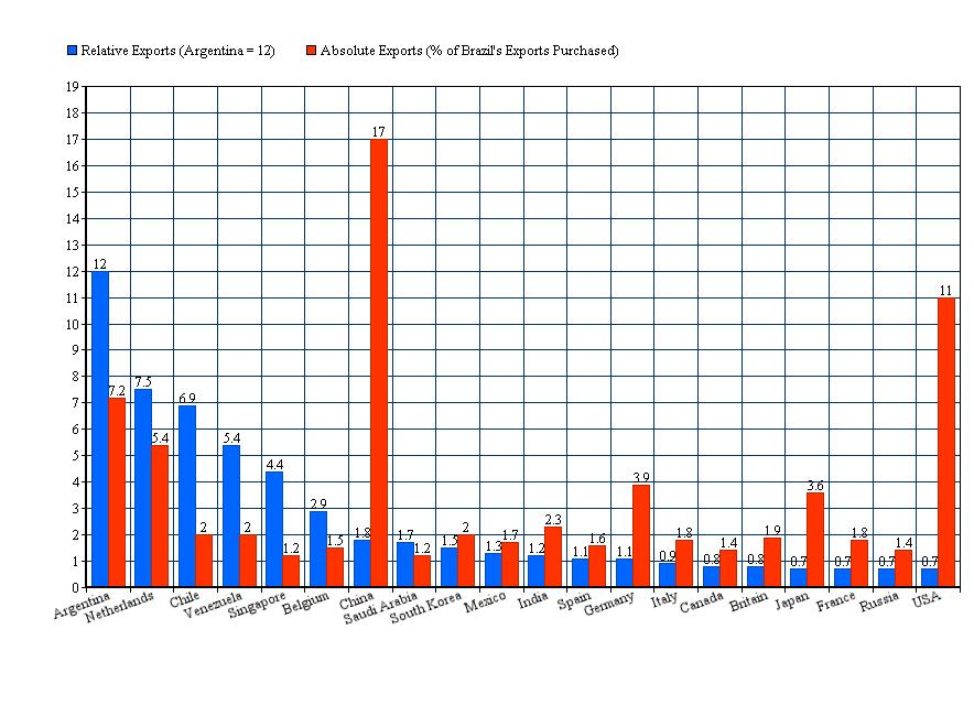 Here we see China’s import patterns, both relative and absolute. The US, though it supplies China with an estimated 8 percent of its overall imports, scores at the very bottom of China’s relative imports list, far behind every other country apart from France. Hong Kong again scores number one in terms of relative trade, but its dominance on relative imports is not nearly as high as it was with exports (this is because most of China’s imports from Hong Kong’s are of services, rather than goods, and the data here does not include services). Taiwan, conversely, is much higher on this imports graph than on the exports graph above. Angola, which was not even on the exports list, scores extremely high in terms of relative imports, because of the oil it supplies China with. Other resource suppliers like Chile, Saudi Arabia, Iran, and Australia also have higher scores on this relative imports list.