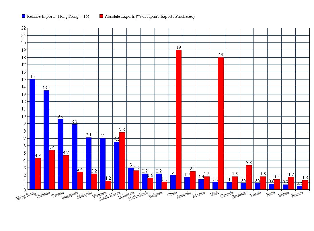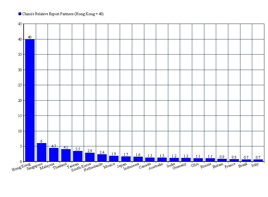In the graph above we see China’s “absolute” export patterns – in other words, the type of trade patterns we would normally hear about in the media. The US buys an estimated 19 percent of China’s exports, Hong Kong buys an estimated 11 percent of China’s exports, Japan buys 8 percent, and so on. In the graph below, however, we see China’s “relative” export patterns, which tell a very different story: