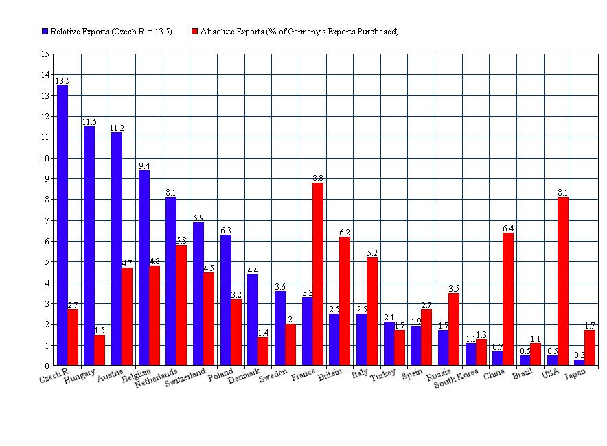 It is interesting to note that France, which buys more of Germany’s exports than any other country does in absolute terms, scores far lower in relative terms than most of the countries in Central and Eastern Europe. Given that most Eastern European countries are still developing, the fact that their relative imports from Germany are so high could be especially significant. Also notable is how tiny the relative exports of Germany to countries like China, the US, and Japan are. Germany is in general the most export-dependent of any economy we will look at in this article.