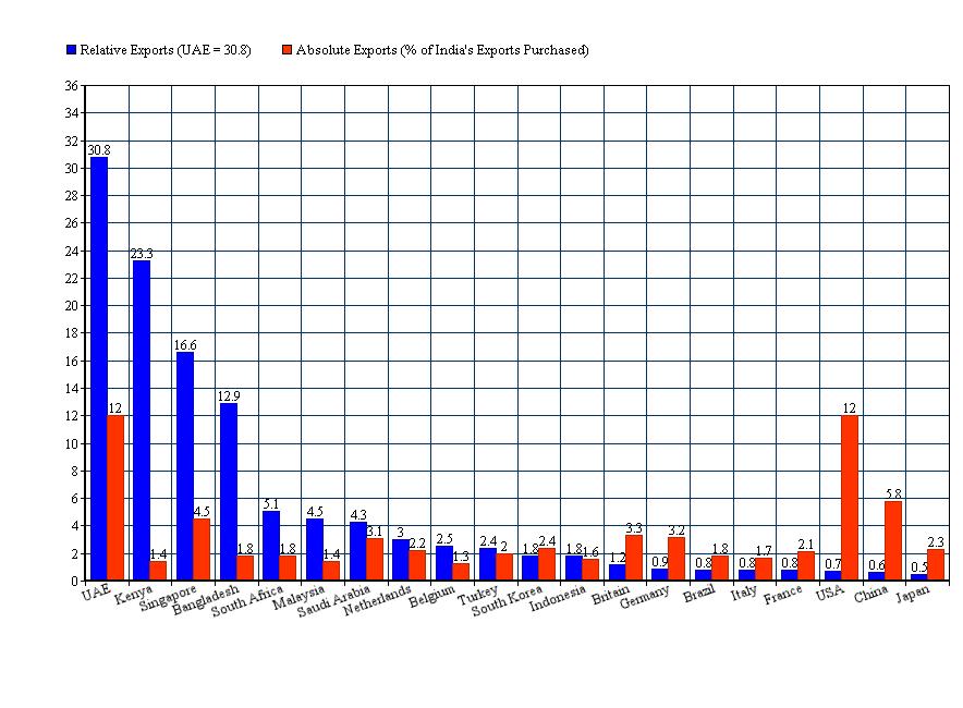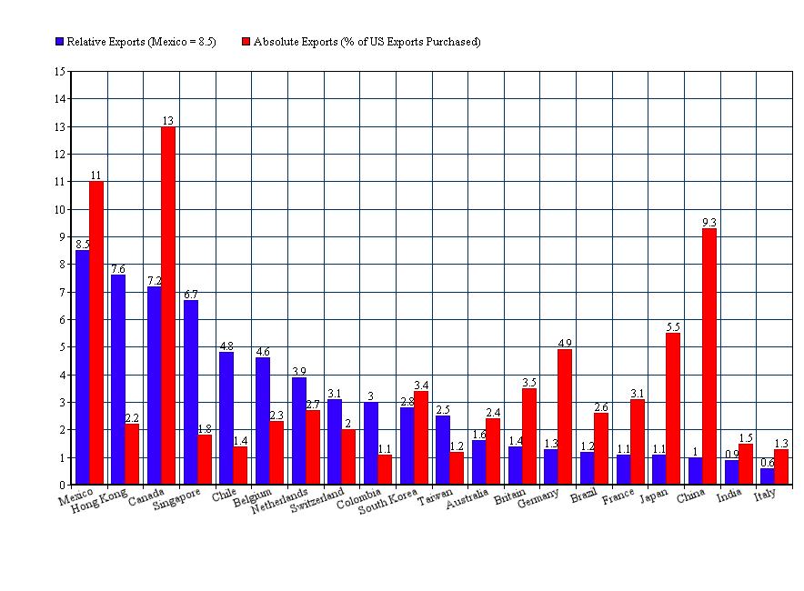Here we see that Mexico is higher than Canada in relative terms, even though Canada is higher in absolute terms. We see that Hong Kong is very high in relative terms, more than 7 times higher than China is (though perhaps most of the US’s exports to Hong Kong are really going to China anyway), as is Singapore. Latin American countries like Chile and Colombia score high in relative terms, as do Belgium, the Netherlands (though both may be trade hubs for US exports to other European countries), and Switzerland. US allies South Korea and Taiwan also score high in relative terms. Major economies like Britain, Germany, France, Japan, China, India, and Italy all score very low in relative terms.