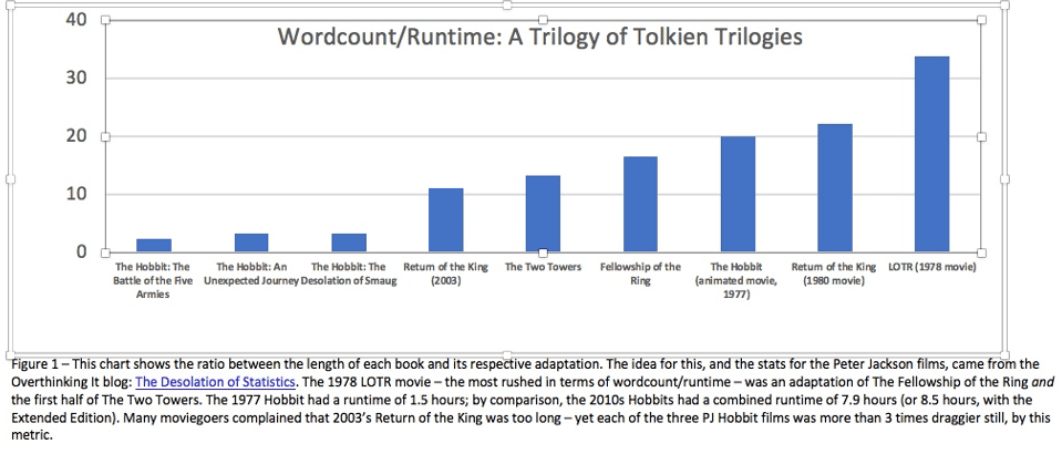 The move toward a Middle Earth TV show is in some ways a continuation of the trend, shown in the chart above, of Tolkien adaptations becoming less and less rushed. The early animated trilogy had to cram The Hobbit and LOTR into roughly five hours of film. Then in the 2000s trilogy, each successive film got longer (even as each book gets shorter) on its path towards Mt. Doom and Best Picture. And in the recent, butter-spread-over-too-much-bread Hobbit trilogy, it took eight hours to cover the material within a single children’s book.